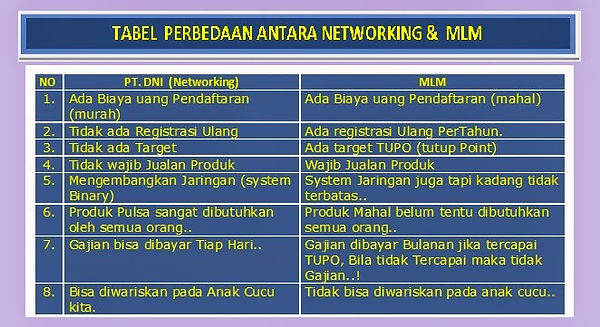 Saya Menjawabnya : "Ya memang di Bisnis PT. DNI Bisnis utamanya adalah Menjalankan Pranchise Jaringan Pulsa (Networking). Tentu saja kita Mengembangkan Jaringan Kita agar mendapatkan Komisi, alias kita mengajak atau mempromosikan dan memperkenalkan ke orang-orang baik yg kita kenal maupun yg tidak kenal yang mau bekerja sama baik untuk KEBUTUHAN PRIBADI maupun untuk mengembangkan BISNISnya.